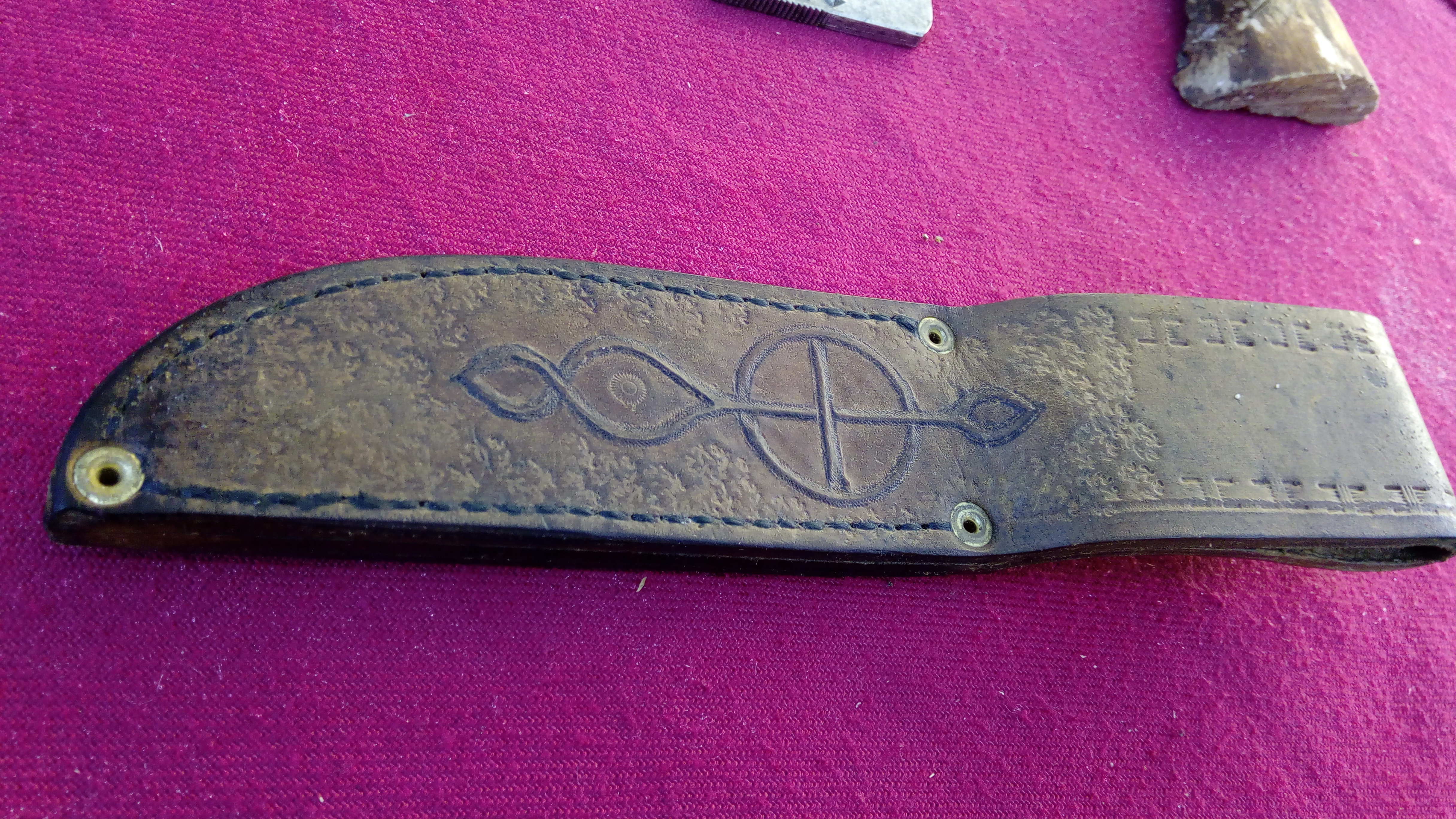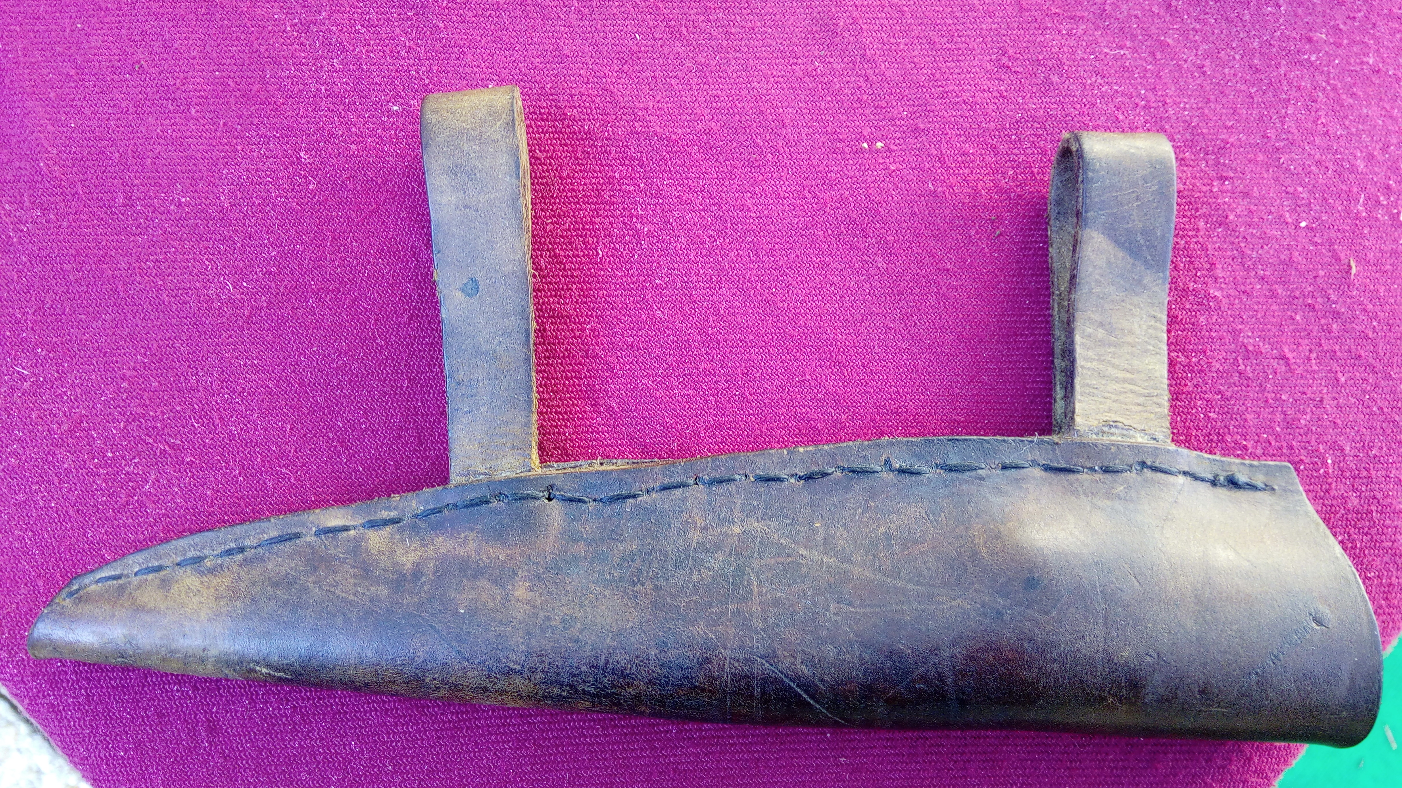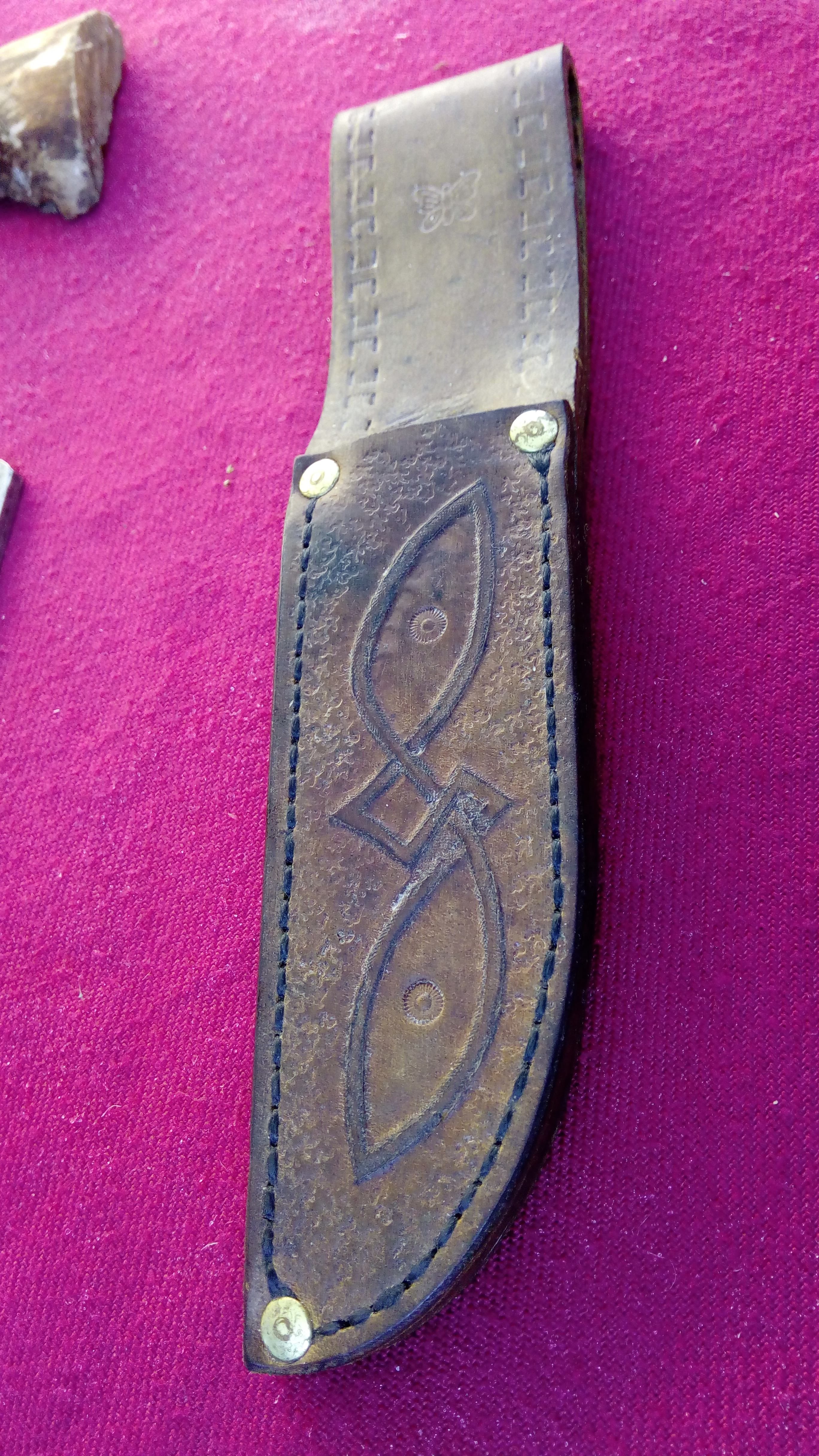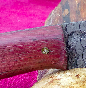Lame en rape de maréchalerie, manche en bois d’amarante, rivets en laiton mosaïque, vendu avec son étui en cuir repoussé motifs celtiques