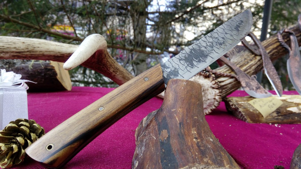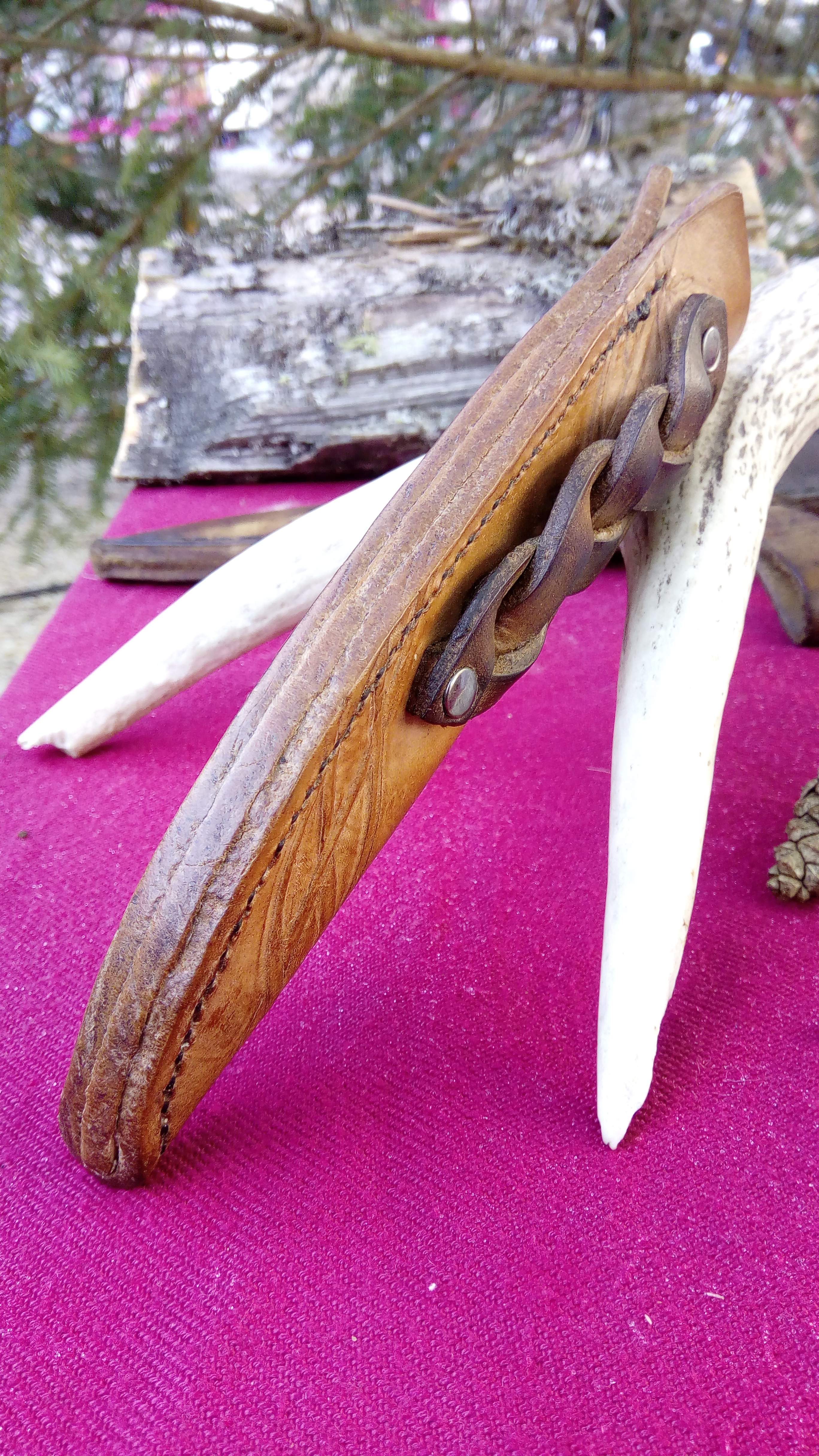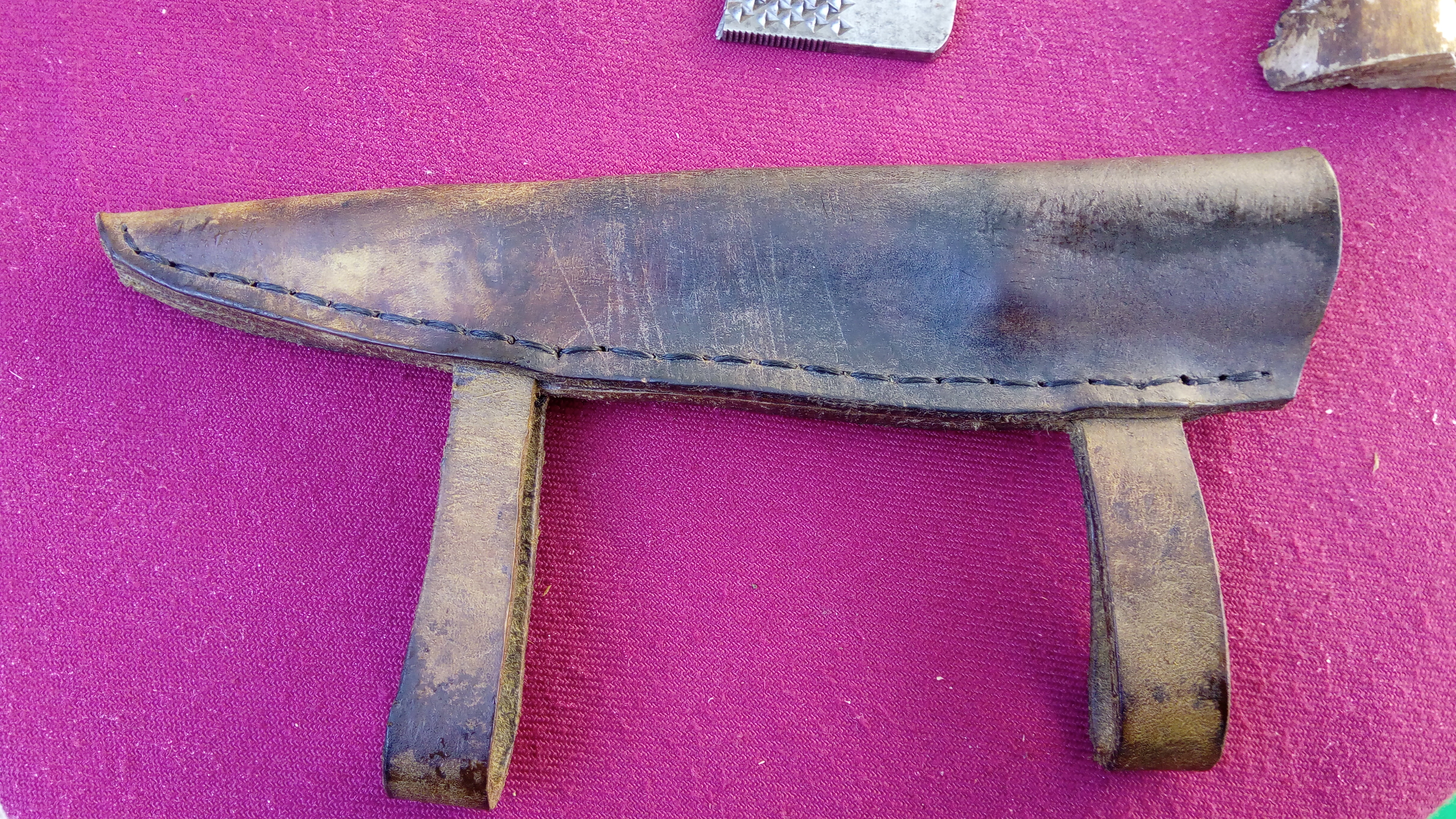 Lame en rape de maréchalerie, manche en bois d’amarante, rivets en laiton mosaïque, vendu avec son étui en cuir repoussé motifs celtiques