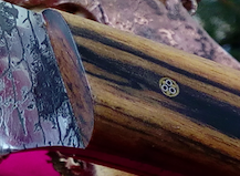 Lame en rape de maréchalerie, manche en bois d’Ebène Royal du Laos, rivets en laiton mosaïque, vendu avec son étui en cuir repoussé motifs tresses