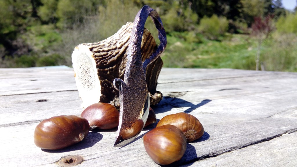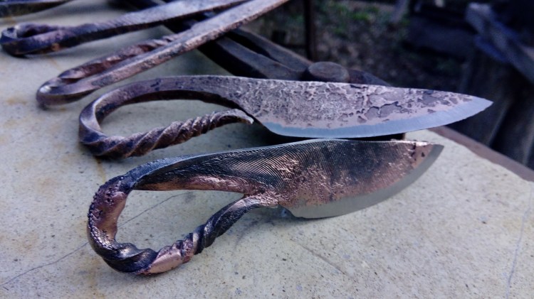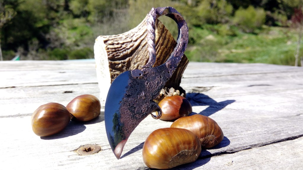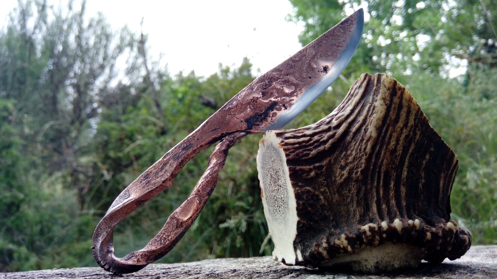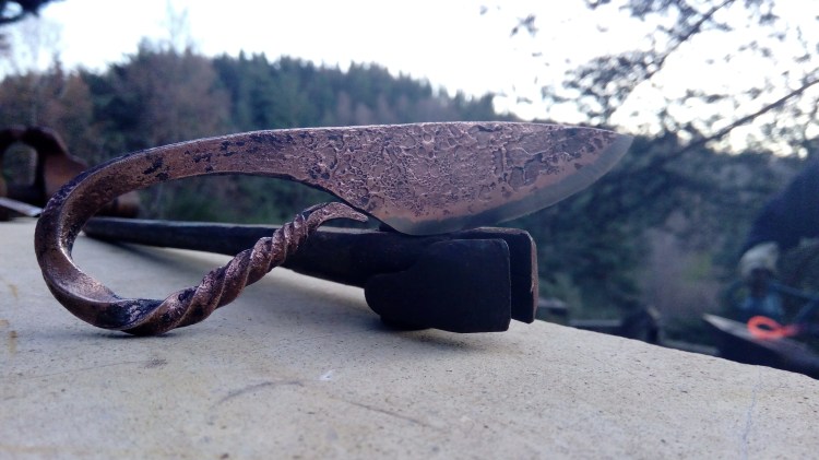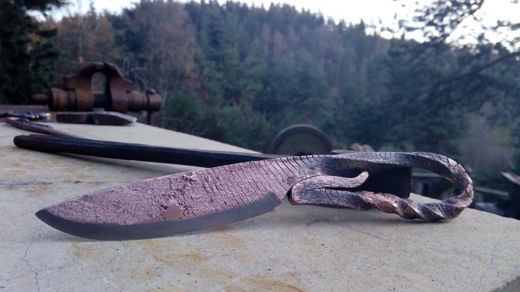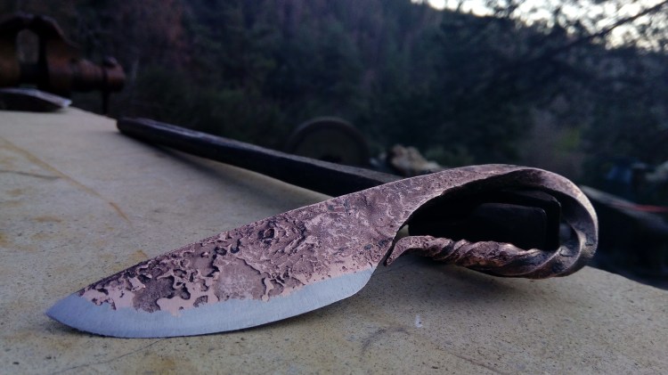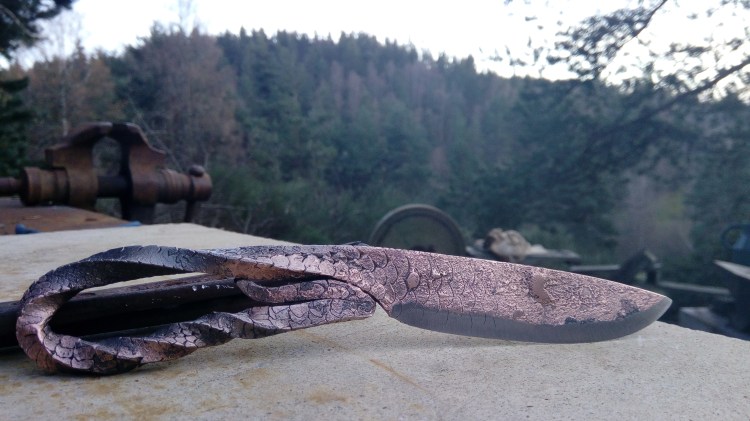 Brut de forge, fusion acier carbone et cuivre, manche torsadé, poli satin