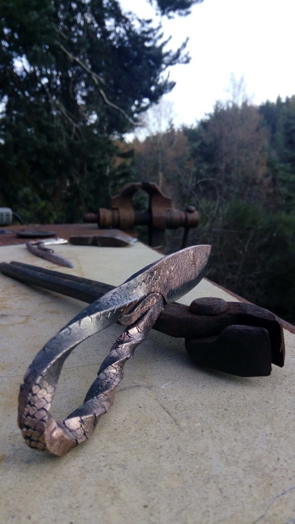 Brut de forge, modèle unique, fusion acier carbone et cuivre, motifs écailles de dragon, zébré couleur argent-cuivre