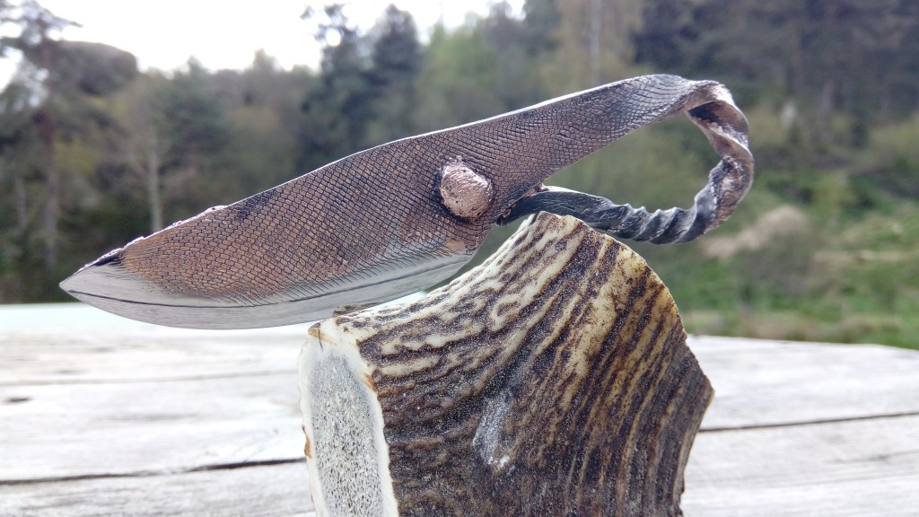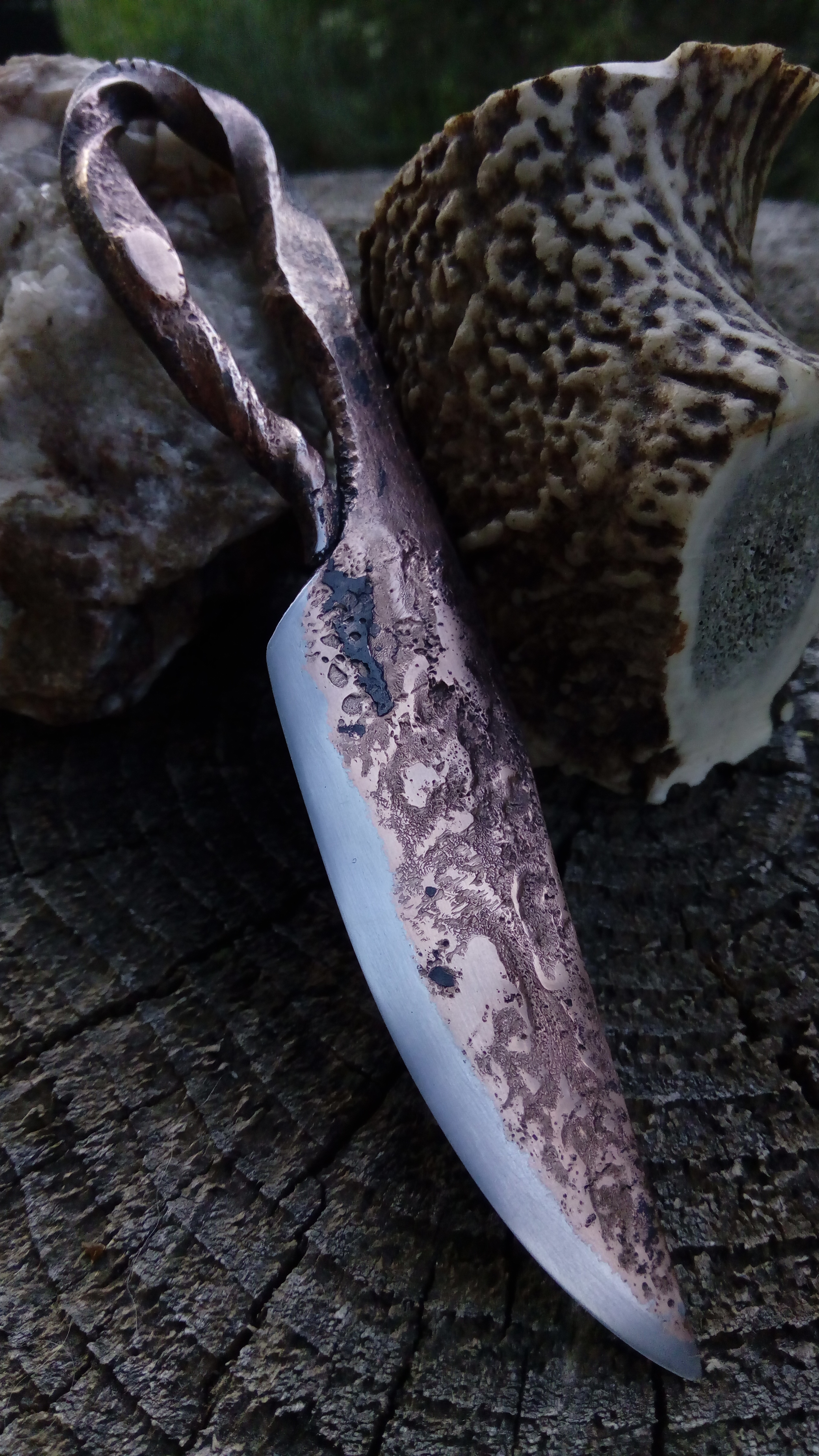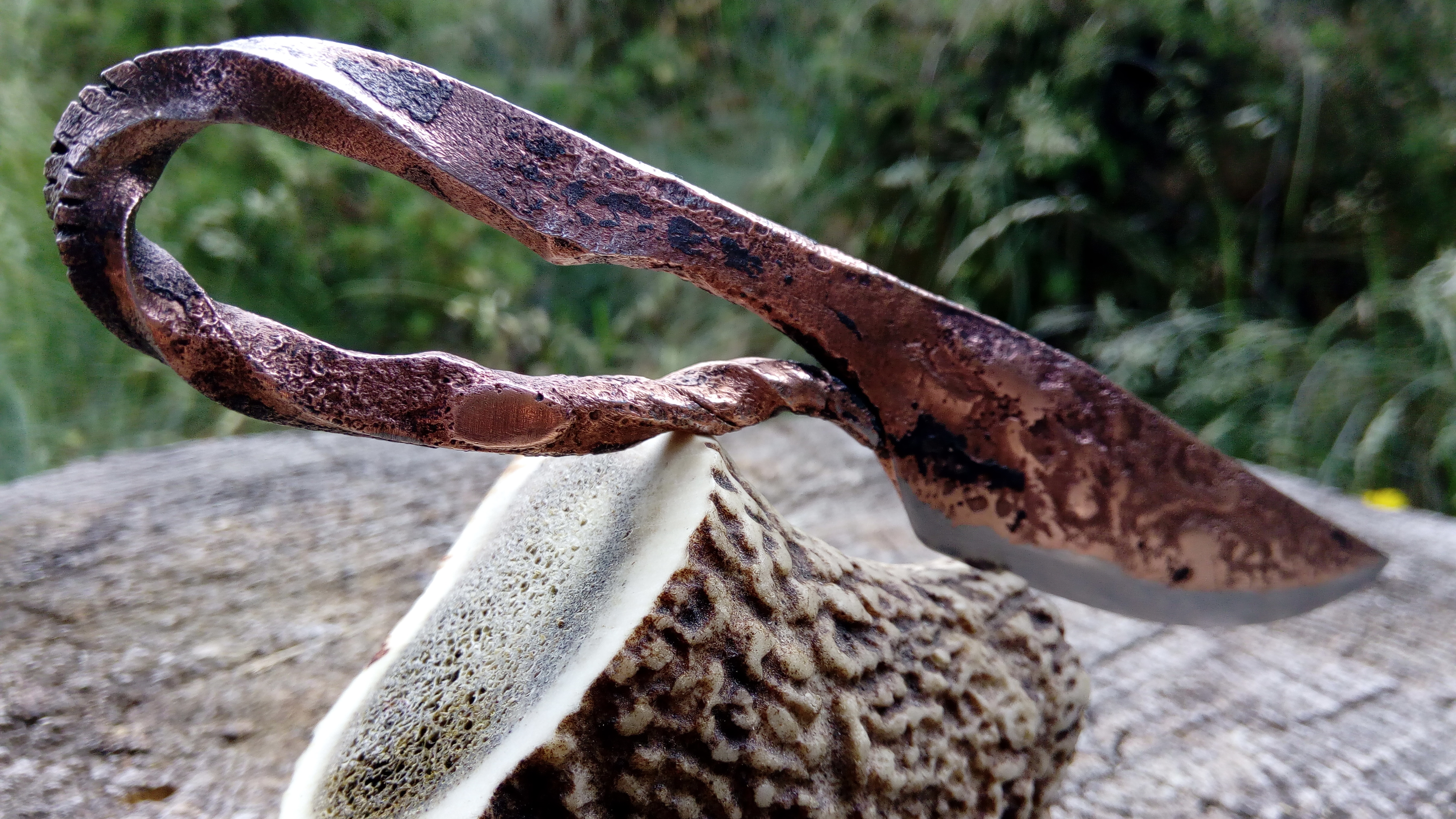 Brut de forge, modèle unique, couteau type celtique, fusion acier carbone et cuivre, motifs striés