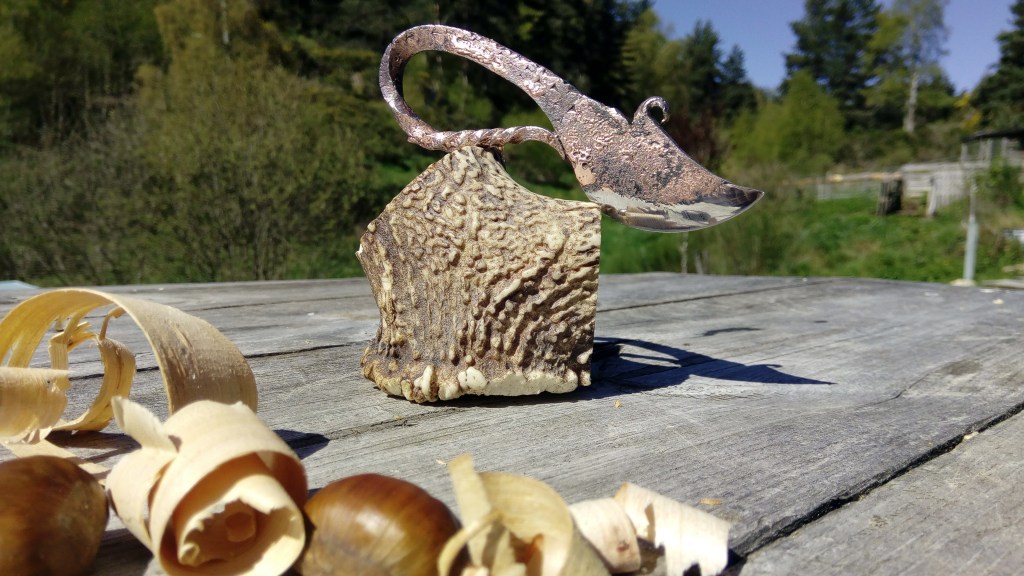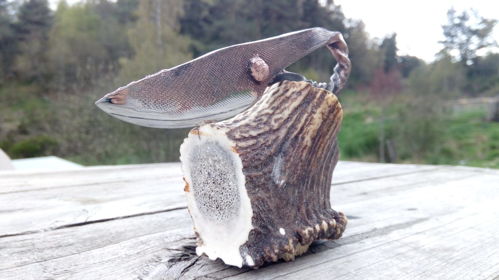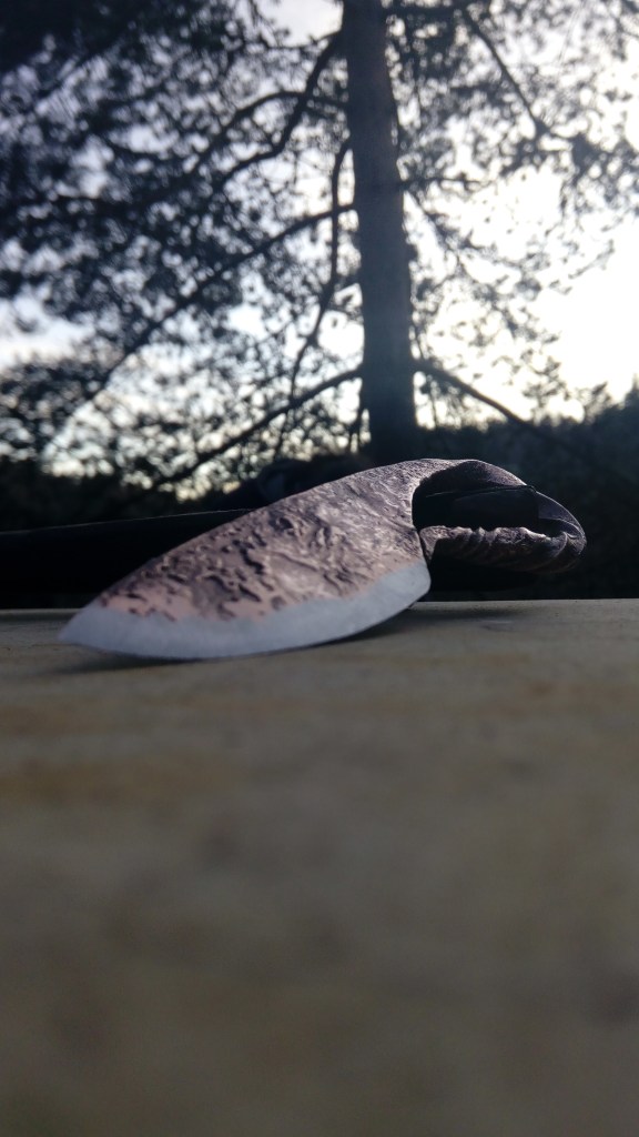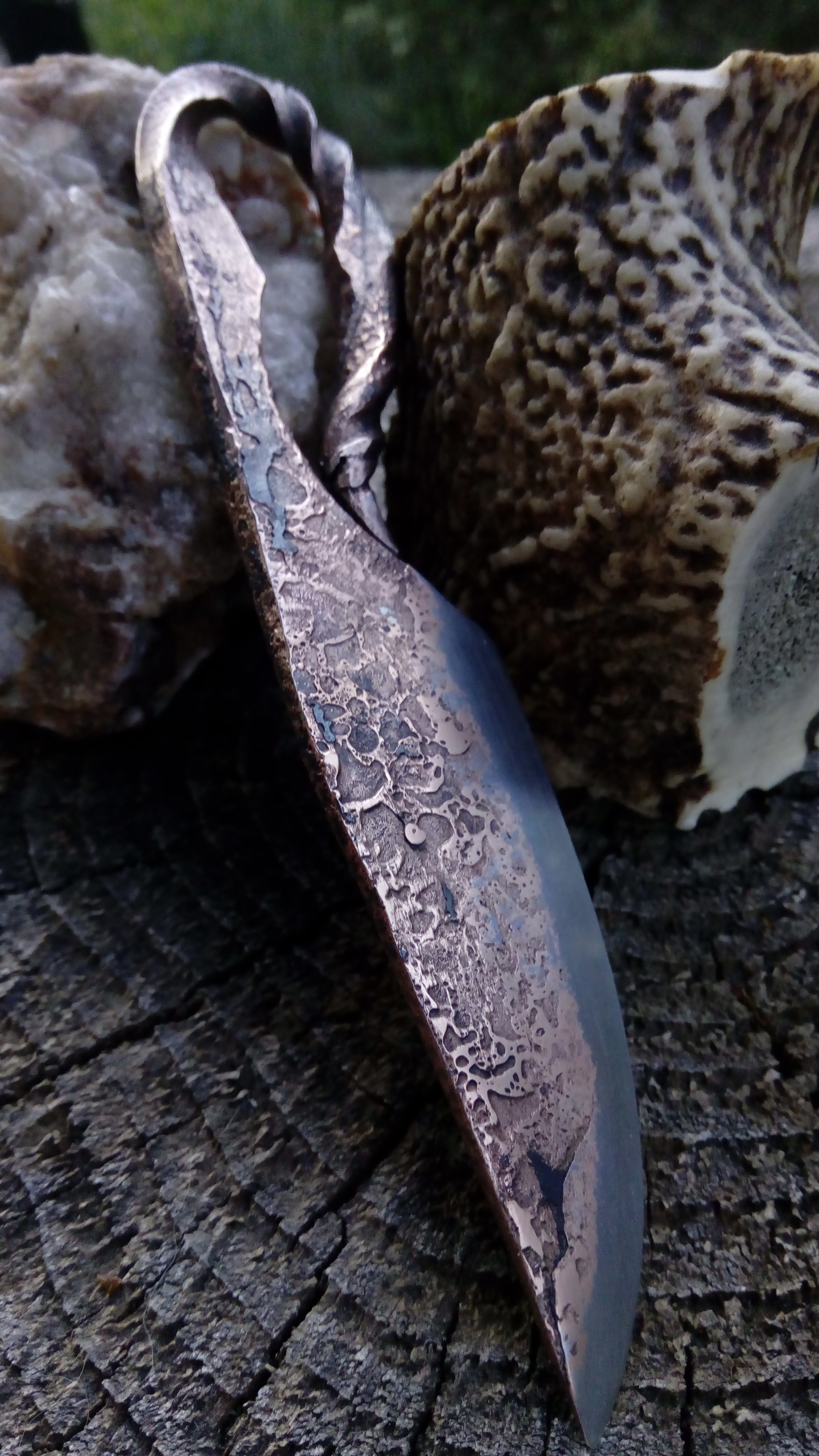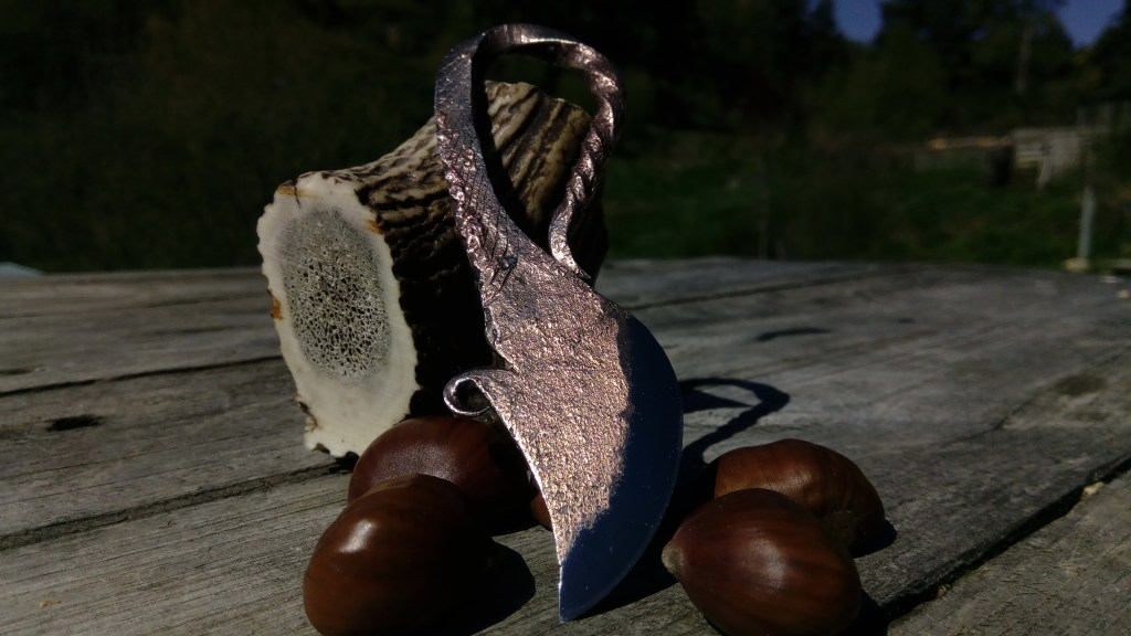 Brut de forge, modèle unique, couteau type celtique, fusion acier carbone et cuivre, motifs striés