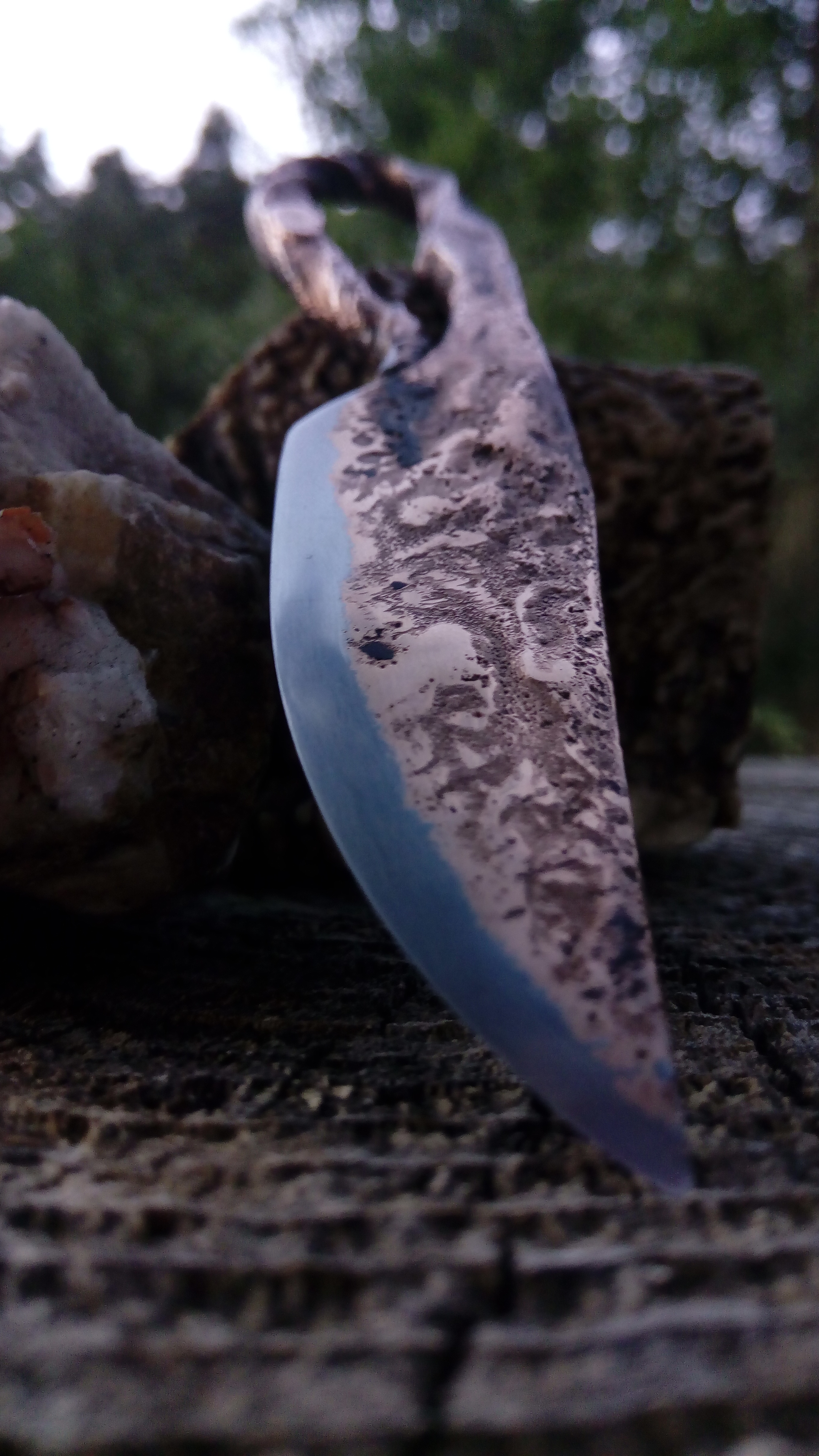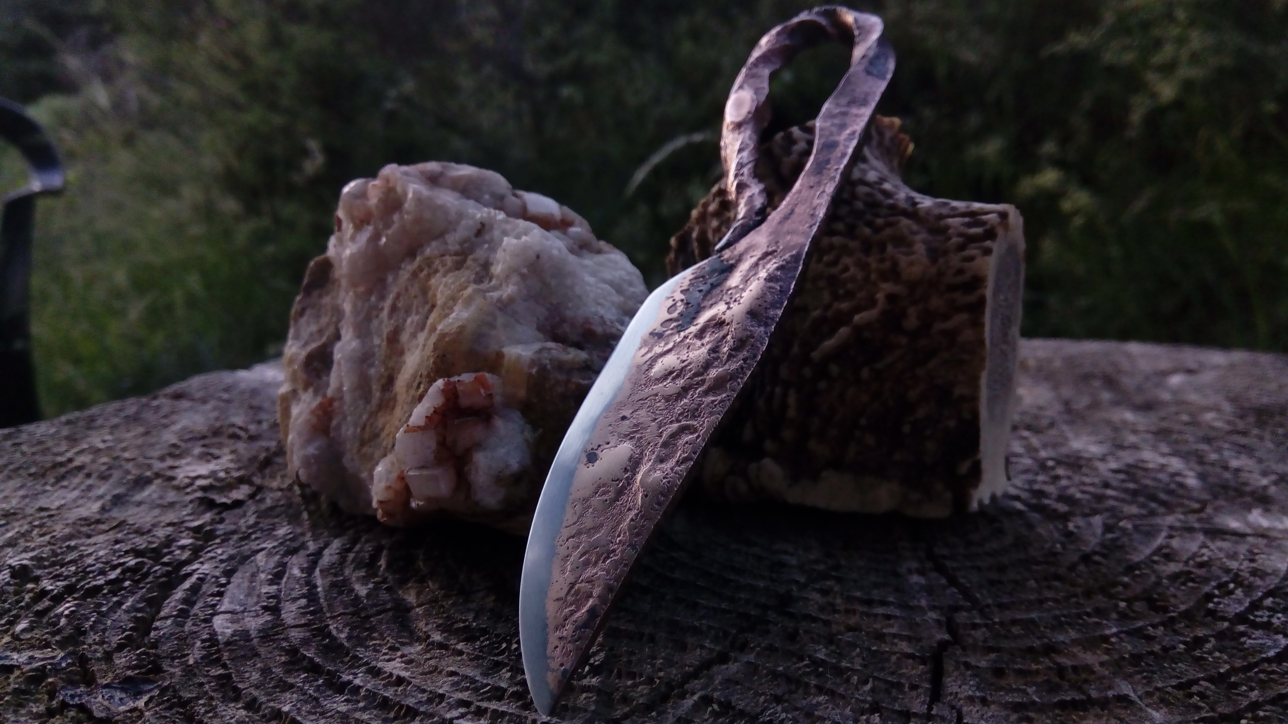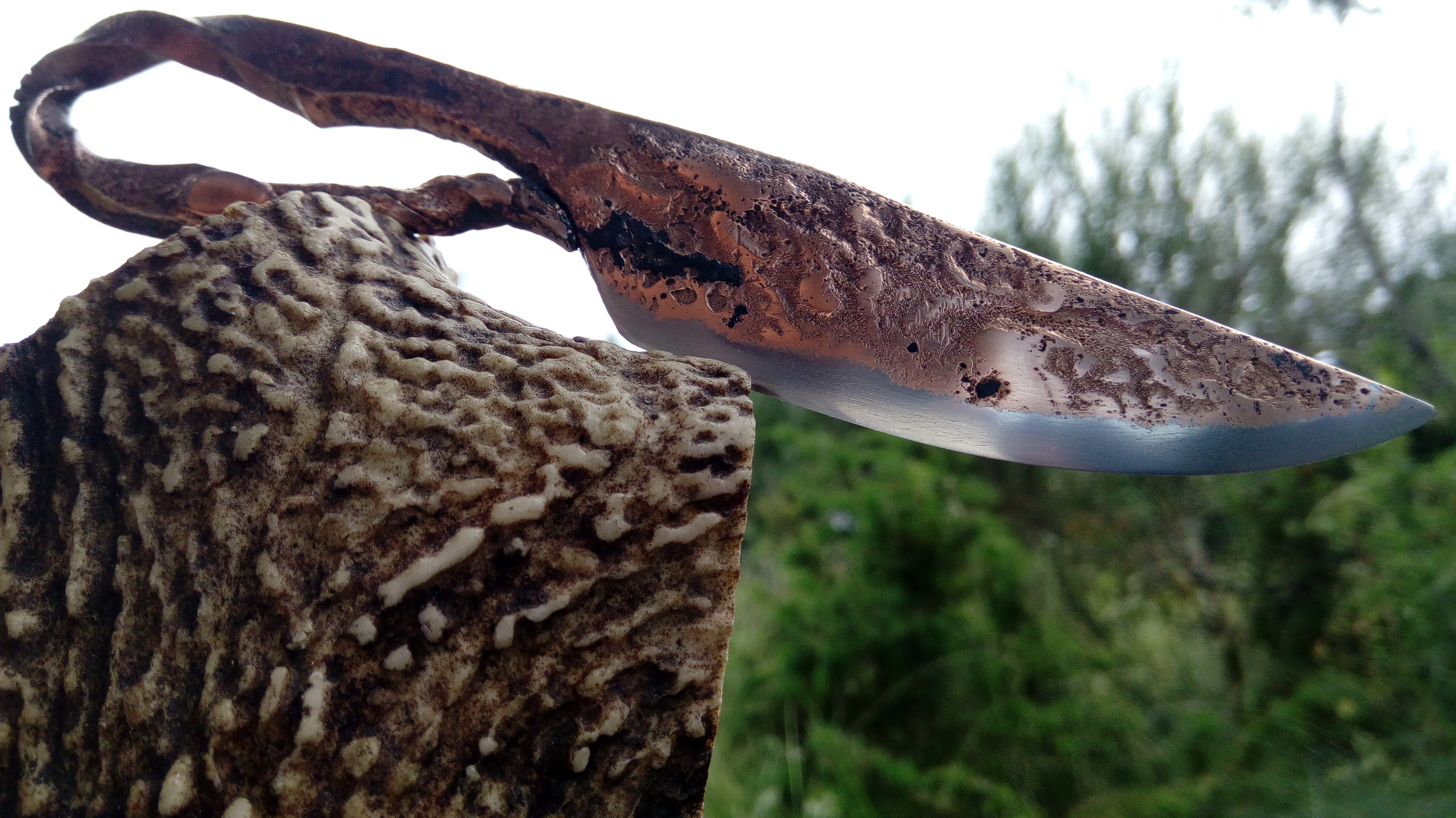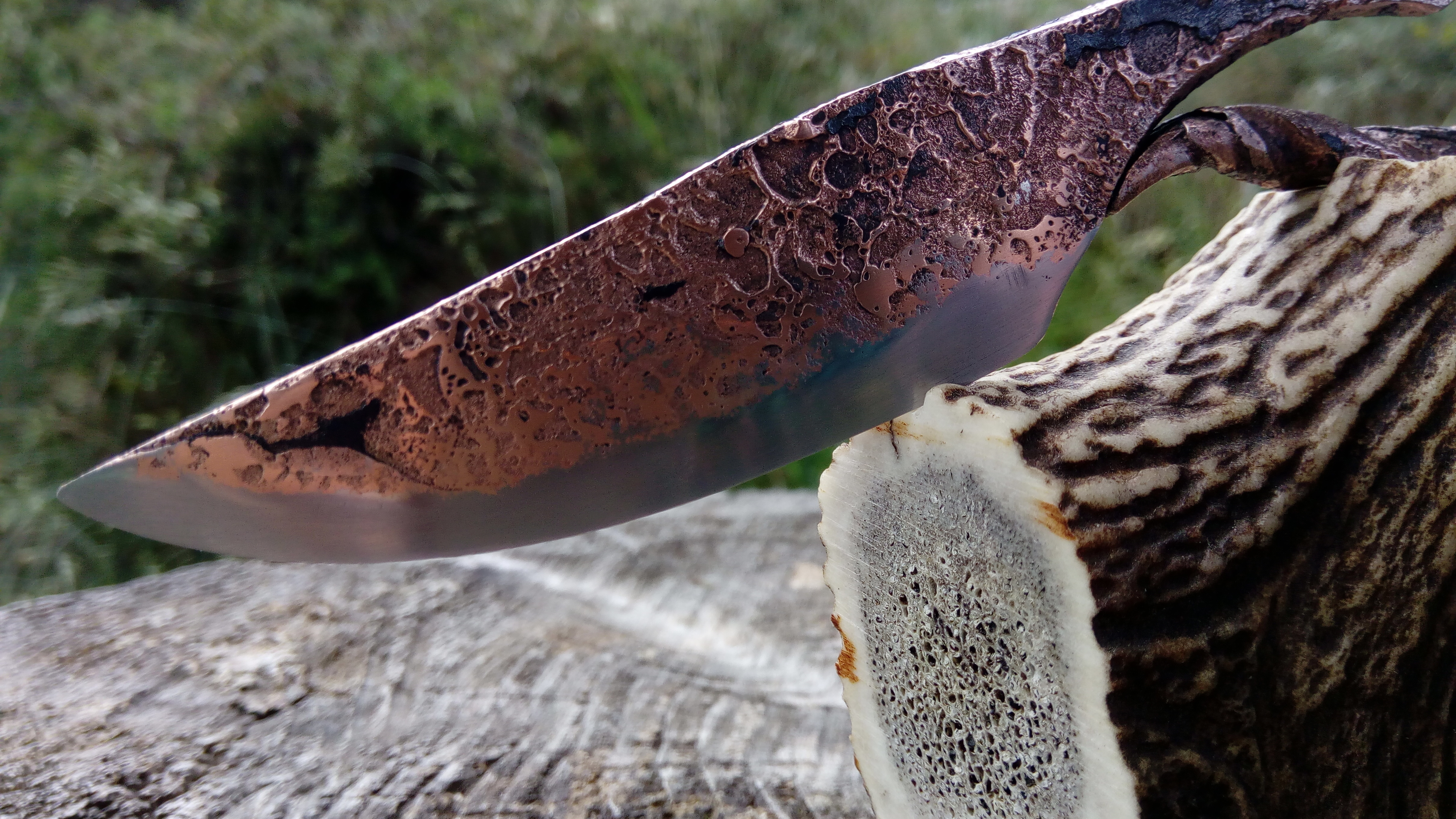 Brut de forge, modèle unique, couteau type celtique, fusion acier carbone et cuivre, motifs cratères lunaires